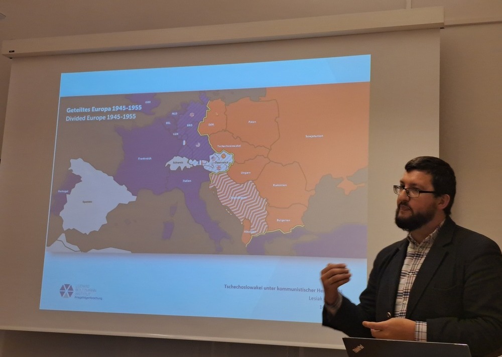 Lesiak, ein kuratorisch erfahrener Experte für tschechoslowakische Zeitgeschichte im niederösterreichischen Grenzlandkontext, gab einen bis in die k.k.-Zeit zurückreichenden, instruktiven Einblick in die Geschichte des „Industriechampions“ und „Vielvölkerstaats“ Tschechoslowakei. Dieser Vorgängerstaat des heutigen Tschechien und der Slowakei war, so Lesiak, bis zum berüchtigten Münchner Abkommen von 1938 und der schrittweisen Machtergreifung der Nationalsozialisten im Land stark westlich orientiert sowie „die letzte Demokratie in Zentraleuropa“ und während der Ausbreitung des Kommunismus bis 1948 die letzte Demokratie im mittleren Osteuropa gewesen.